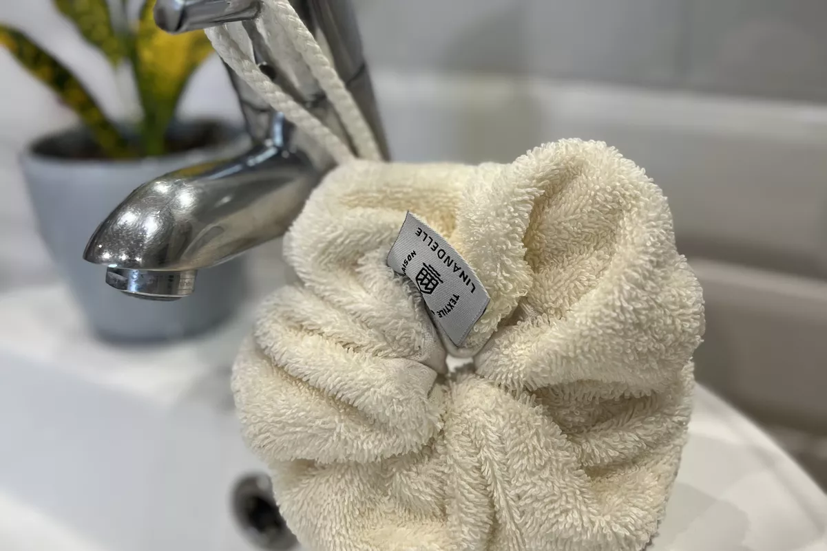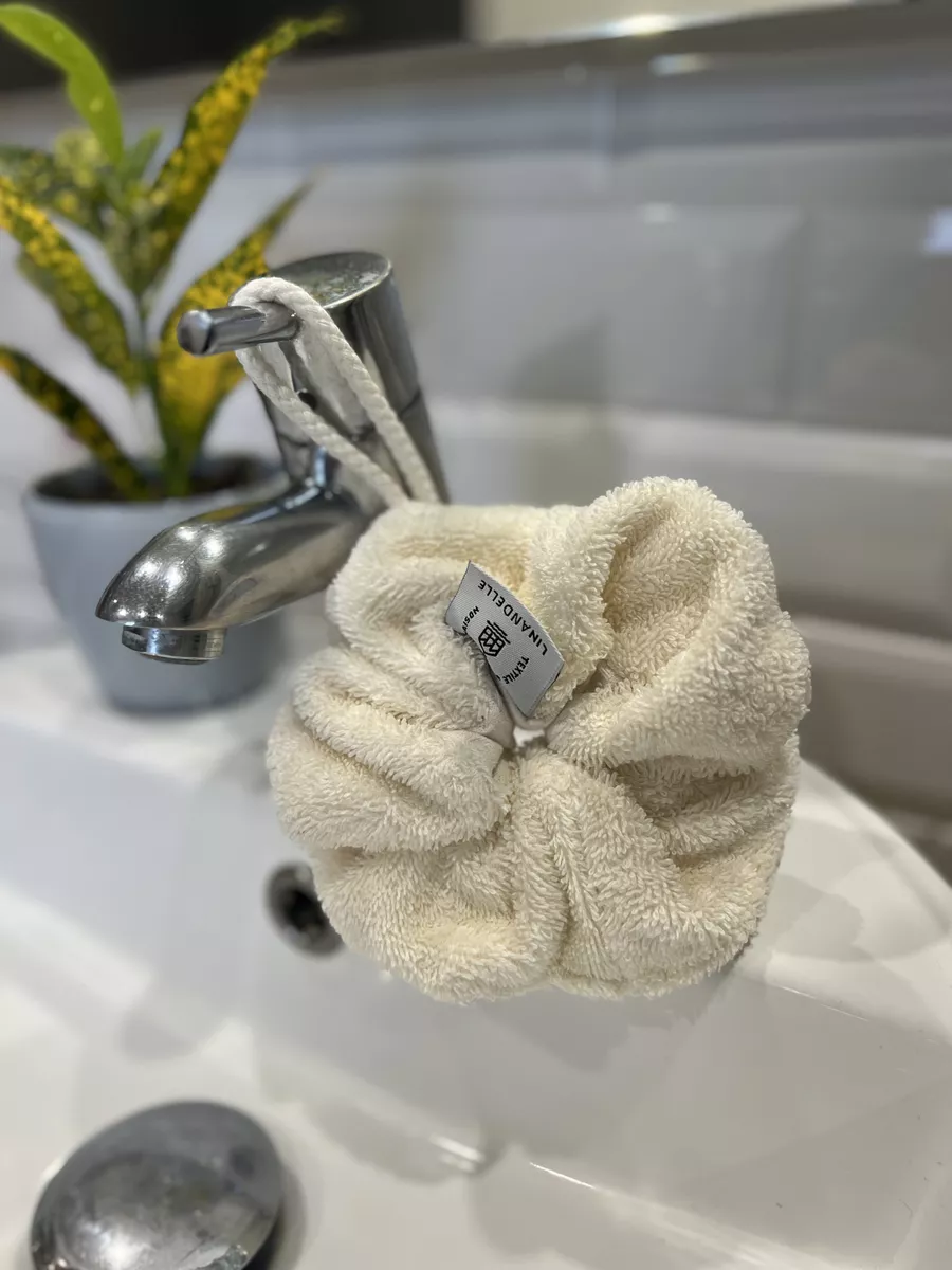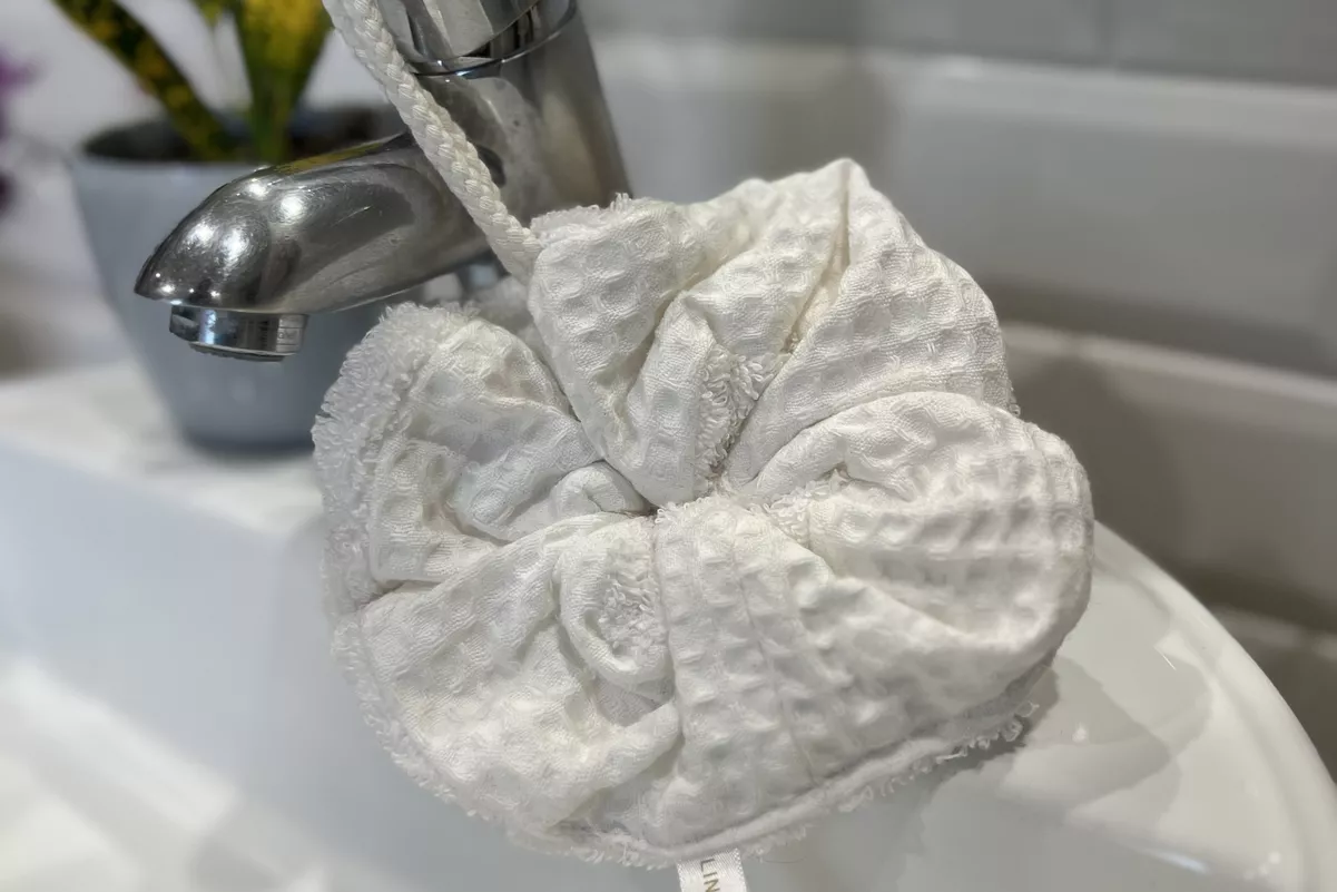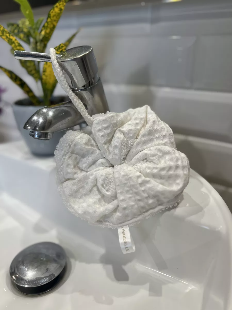 Fruit d'une belle collaboration avec les ateliers normands Linandelle, la fleur de douche en tissu nid d'abeille et éponge sera parfaite pour un moment tout doux sous la douche.