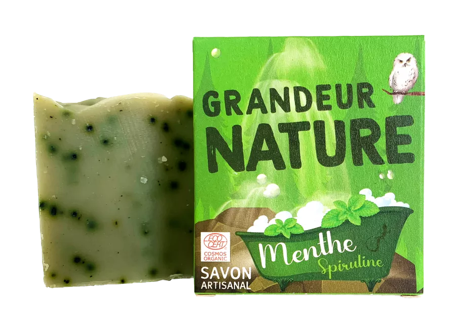 Huile d’olive*, huile de coco*, beurre de karité*, eau, soude, huile de colza*, huile de cameline*, argile verte, huile essentielle de menthe poivrée*, spiruline, huile essentielle de menthe verte*.